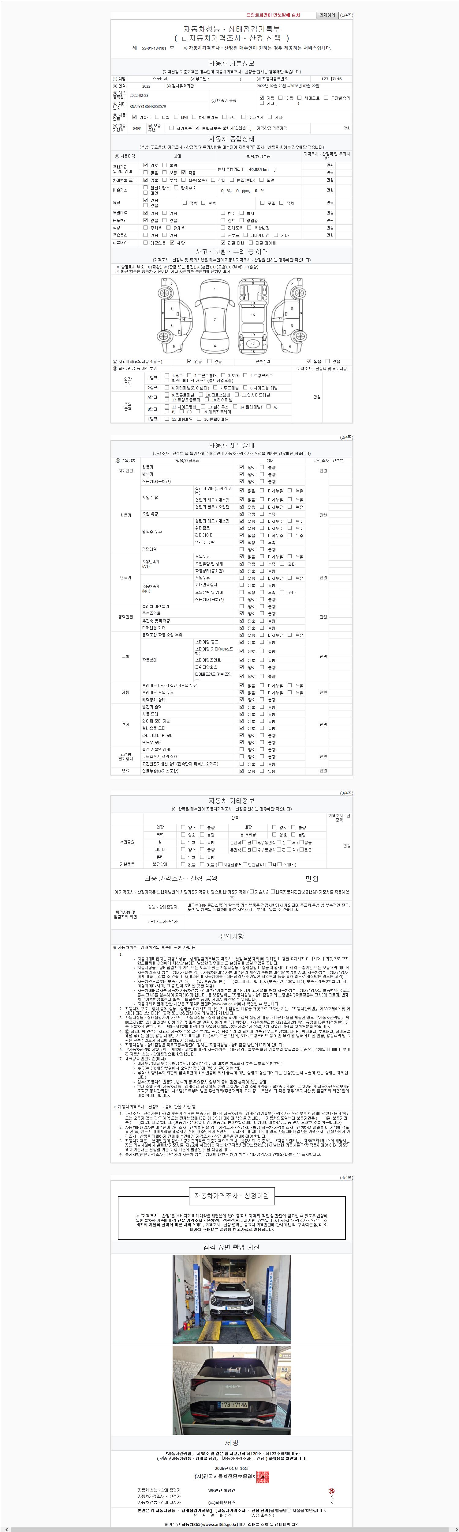 | 주행거리 | 49,085 km | 차량번호 | 173나7146 | 사고유무 | 성능기록부 참조 | 제시번호 | 제 2147483647 호 |