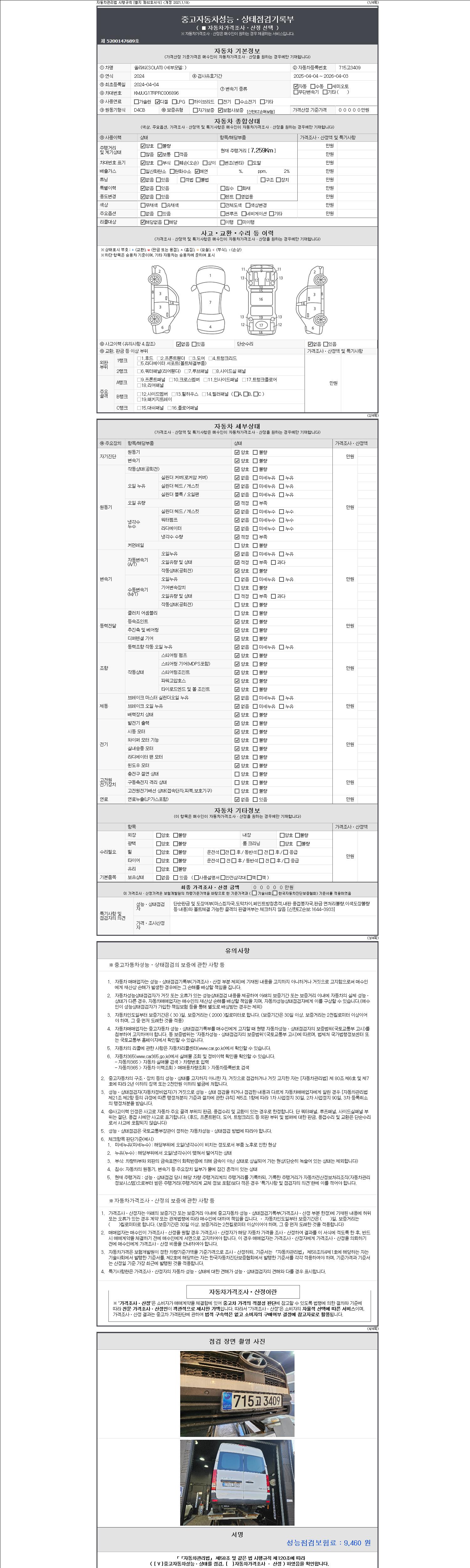 | 주행거리 | 7,259 km | 차량번호 | 715고3409 | 사고유무 | 성능기록부 참조 | 제시번호 | 제 2147483647 호 |