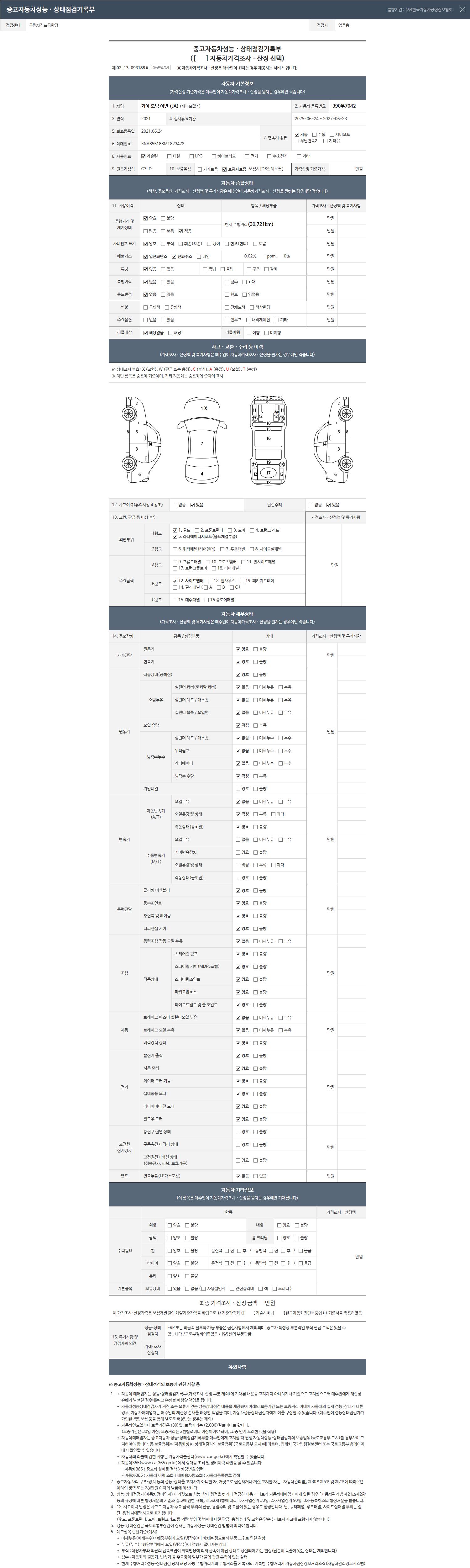 | 주행거리 | 30,721 km | 차량번호 | 390무7042 | 사고유무 | 성능기록부 참조 | 제시번호 | 제 2026047353 호 |